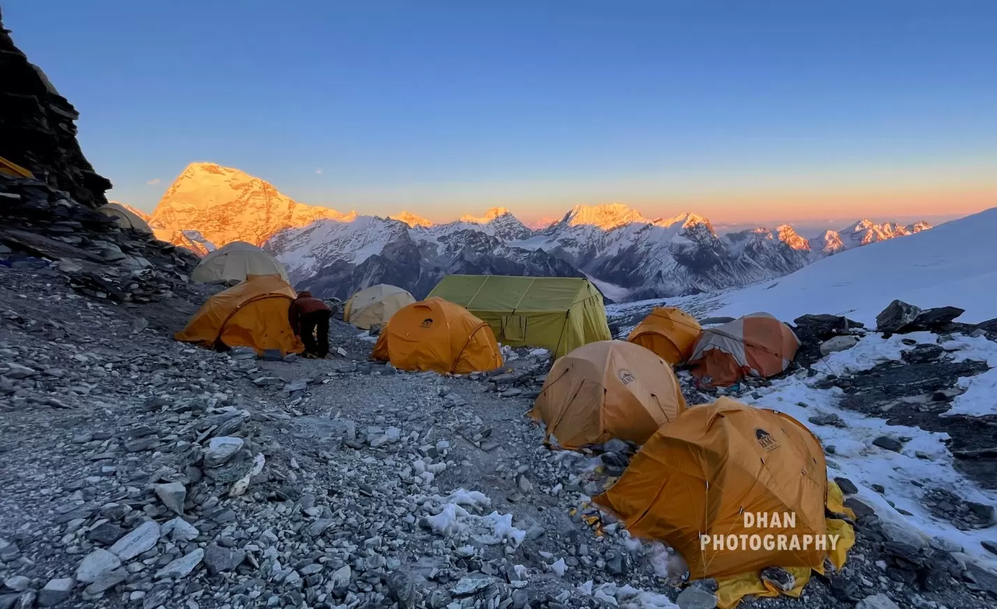 Le départ se fait tôt le matin pour gravir les pentes douces menant au sommet central. Pour accéder au sommet, il faut emprunter une petite pente de 40 degrés sur 60 mètres de hauteur. Une vue panoramique s'offre à vous en embrassant du regard le Baruntse (7 200 m), le Makalu (8 475 m), l'Everest (8 848 m), le Lotse (8 501 m), le Kangchenjunga (8 586 m) et le Cho Oyu (8 201 m). Le Mera Peak est un point de vue exceptionnel qui offre une vue à couper le souffle sur les géants de la Terre au Népal ! Nous descendons au Mera La, puis nous continuons notre chemin en direction du versant Hunku où nous établirons notre camp, à Kongme Dingma, dans la verdure, à 4 800 m. Cette étape est considérée comme longue. Cette vallée inhabitée est totalement isolée, ce qui rend l'engagement incontestable car toute fuite est clairement problématique. Hébergement : sous tente.