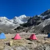 Après trois heures de marche, nous atteignons le camp de base du Mera Peak, situé à 5 415 mètres d'altitude. Entre novembre et avril, le col que nous emprunterons est recouvert de neige. Une fois de plus, les paysages sont spectaculaires et nous prenons le temps d'admirer le panorama sur les sommets de l'Himalaya. Hébergement : en lodge.