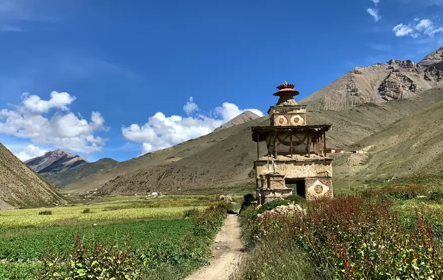 Nous continuons notre progression à travers les gorges de la Tarap, aux eaux transparentes, par un sentier raide en corniche, puis des « plats népalais » bordés d'épicéas et de genévriers. Une nature sauvage d'argousiers, berbéris et épine-vinettes sur des terres marécageuses. Nous apercevrons peut-être des troupeaux de bharals avant d'arriver sur l'immense plateau tibétain, à 4 000 m d'altitude. Découverte, au lever du jour, du village de Dho abritant des murs de Mani gravés, des chortens typiques du Dolpo. Hébergement : sous tente.