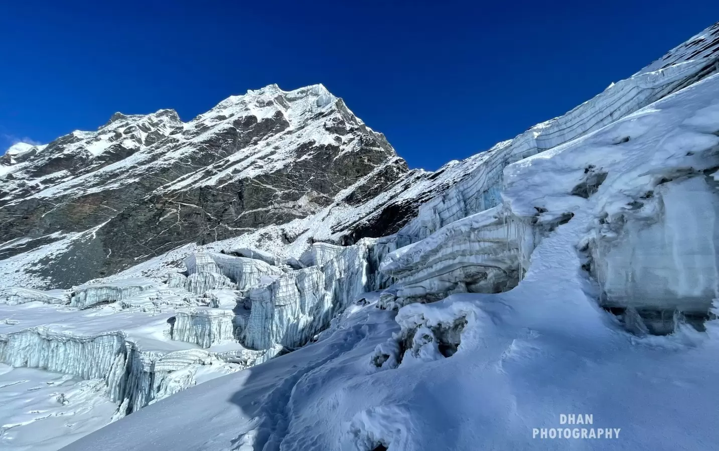 Nous suivons la moraine de Dig, glacier, jusqu'à Dig Khraka, offrant une vue imprenable sur le Kyashar (6770 m). Le chemin débute en empruntant le sentier le long des glaciers Hinku Nup et Shar, puis monte plus abruptement jusqu'à Khare (5045 m). Hébergement : en lodge.