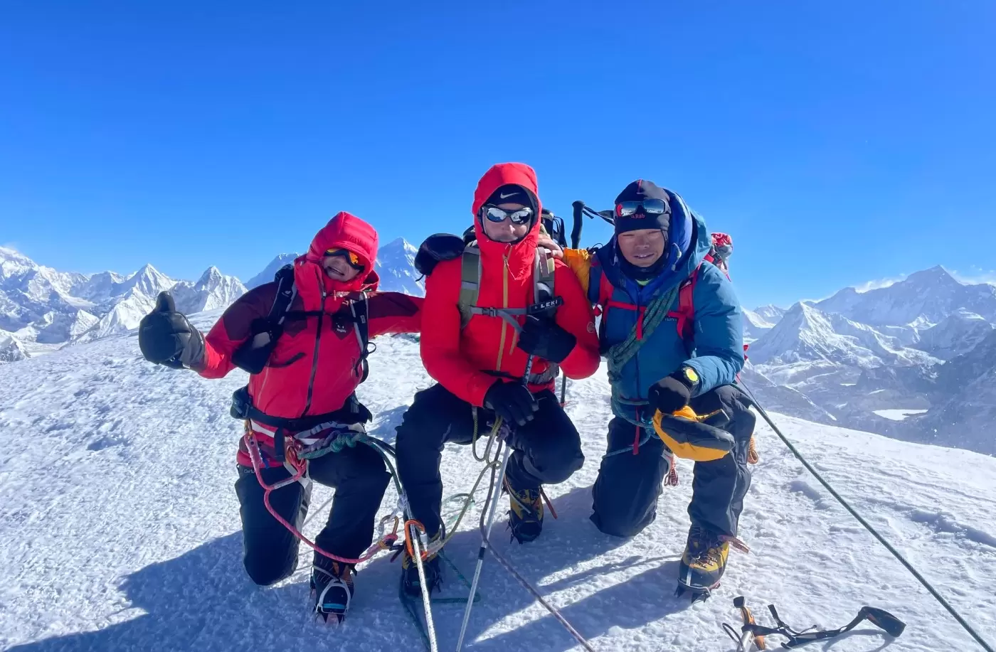 Départ matinal pour atteindre le sommet de l'Amphulapcha. Nous fixerons quelques cordes pour franchir les passages les plus raides du petit glacier. Le Lhotse, avec sa face Sud et son océan vertical, offre une vue panoramique sur le versant Khumbu lors de cette traversée.